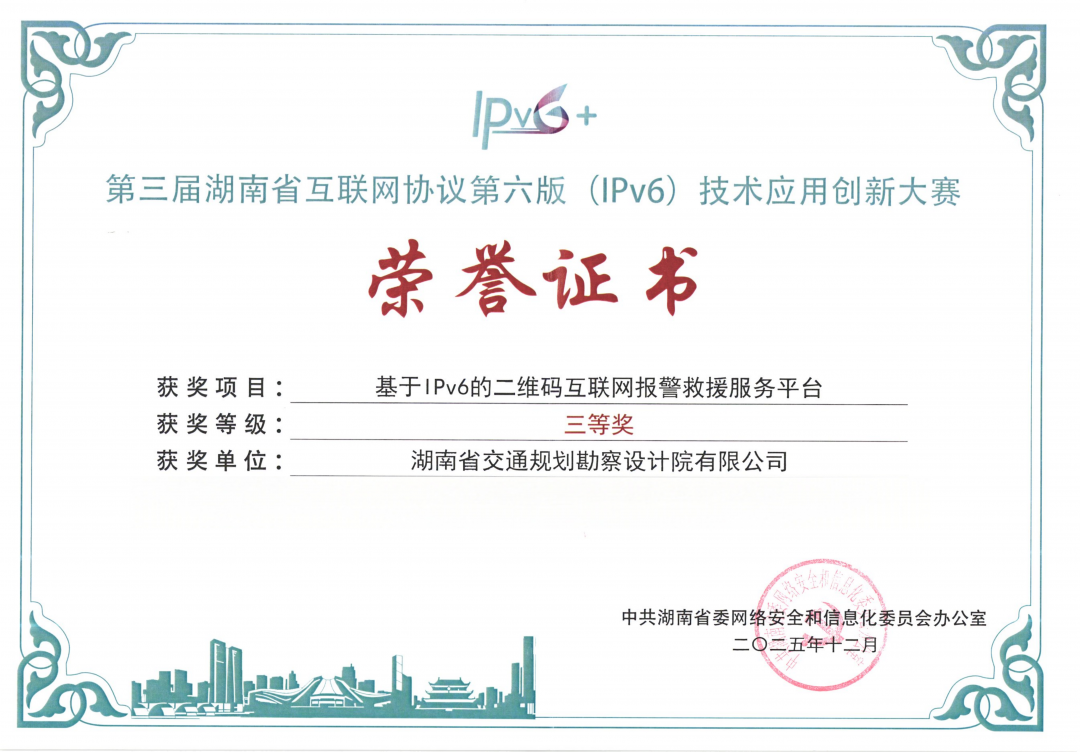 近日,第三屆湖南省IPv6技術應用創新大賽頒獎儀式在長沙舉行。大賽由省委網信辦主辦,旨在挖掘IPv6技術應用創新成果,推動其在重點領域深度應用。湖南交通設計院牽頭申報的“基于IPv6的二維碼互聯網報警救援服務平臺”項目榮獲三等獎。 項目聚焦高速公路應急救援痛點,依托IPv...