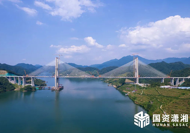 7月7日上午,隨著最后一塊橋面板精準吊裝到位,雪峰湖大橋成功實現合龍。這也標志著官新高速全線順利貫通,距離今年底通車的目標更進一步。雪峰湖大橋位于益陽市安化縣境內,橫跨柘溪水庫,全長1187米,主跨500米,兩個主塔均采用H形設計,其中陸上7號主塔高155 9米,水中6號主塔高202 4米,為雙塔雙索面半漂浮體系斜拉橋,是湖南省最大跨度鋼混組合梁斜拉橋。